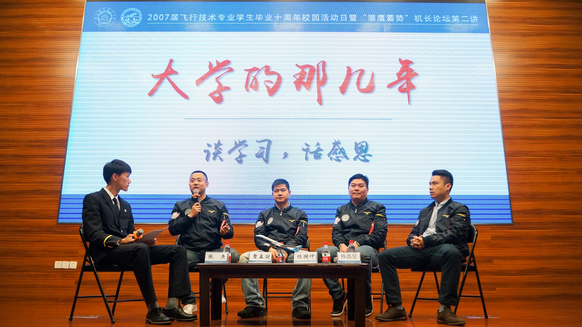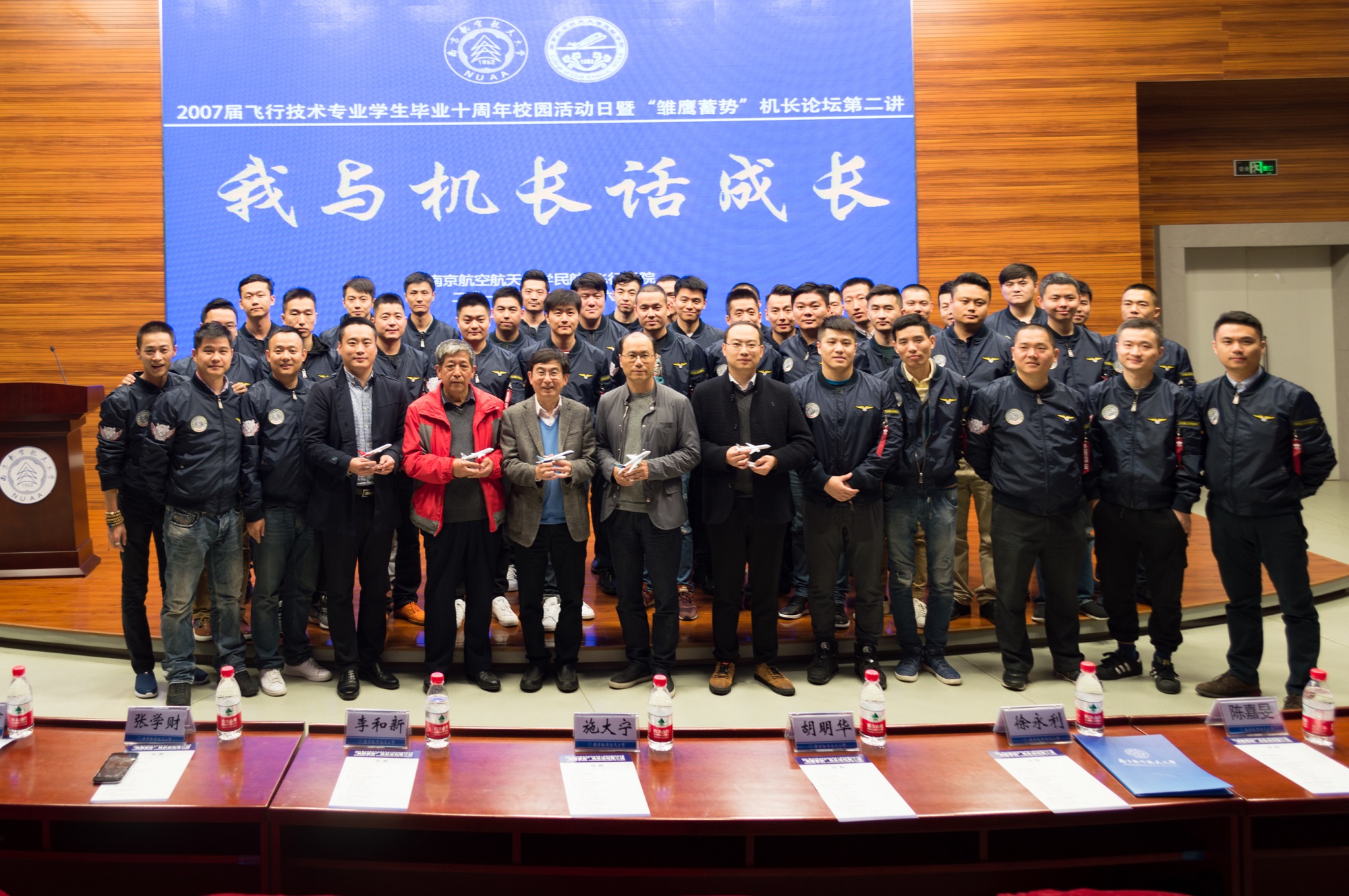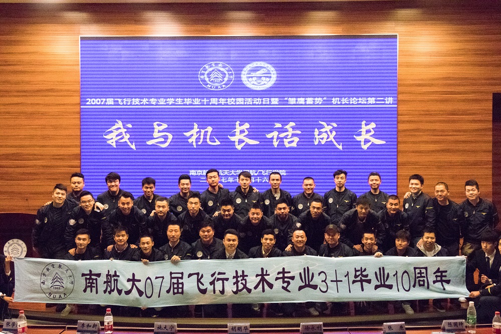 2017年11月16日,2007届飞行技术专业“3+1”学生毕业十周年校园活动日暨“雏鹰蓄势”机长论坛第二讲在将军路校区顺利举行。40名南航大毕业的优秀机长代表怀着激动的心情回到母校,担任本期机长论坛的开讲嘉宾,为学生现场教学开飞机的知识。副校长施大宁教授、民航/飞行学院院长胡明华、发展联络部徐永利、成人抖音 党委副书记李和新以及民航/飞行学院师生代表400余人参加了本次活动。