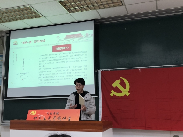 “两学一做”读书分享会,曾江涛、张杰毅、吕雨微同学分享了自己的读书感悟。曾江涛同学通过书籍《制度的笼子》告诉大家制度的力量。张杰毅同学为大家分享朱光潜先生的《谈美书简》,讨论了该书的影响,讨论了书中马克思主义美学的特征,深入浅出,令人眼前一亮。