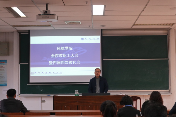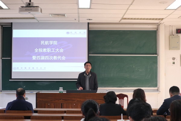 院长胡明华汇报了学院2018年的主要工作成效,2019年的重点工作以及学院2018年度财务情况。他从党建工作,师资队伍建设,学科与科研工作,教学工作,国际合作,飞行办学,学生工作以及董事会、培训工作八个方面全面介绍了2019年学院重点工作。聚焦学院年度工作重点,学院将着力抓好六件大事:首先,加快民航特色办学步伐,这也被列为学校八件重点工作之一,这给成人抖音 全体师生员工带来了极大信心和挑战。其次,本学年学院将进行党委换届工作、深化学院综合改革工作、开展第五轮学科预评估工作、加快土木工程系融入发展以及完成天目湖校区搬迁、新大楼搬迁等大事。他指出,2019年是落实校十六次党代会决策部署、推进“双一流”建设各项任务的攻坚之年,鼓励全体教职工坚持“立足民航”,“服务民航”、“引领民航”,凝心聚力,锐意进取,争取新的突破。