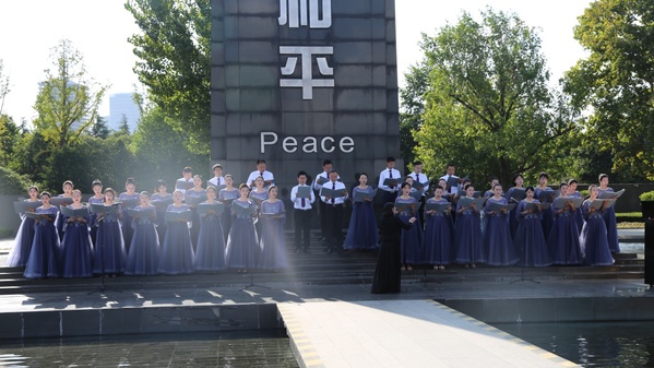 参观结束后,同学们在和平广场手工折叠象征和平的“紫金草”,表达对世界和平、民族振兴的美好愿景。随后,成人抖音 学生合唱团带来歌曲《我爱祖国的蓝天》,“紫金草”合唱团现场演唱《让世界充满和平》、《和平颂》两首歌曲。活动的最后,全体师生共同唱响《让世界充满爱》,将现场气氛推到高潮。