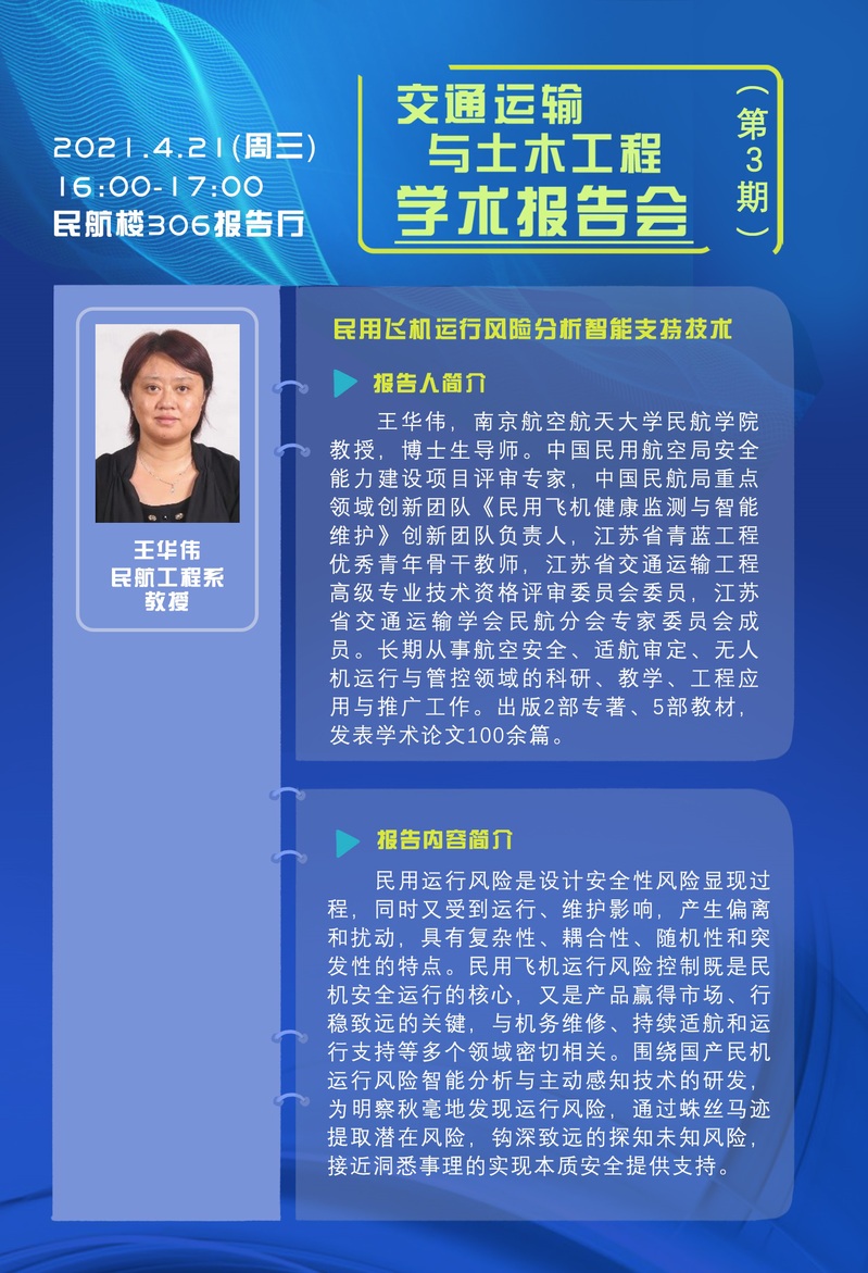 成人抖音 教授,博士生导师。中国民用航空局安全能力建设项目评审专家,中国民航局重点领域创新团队《民用飞机健康监测与智能维护》创新团队负责人,江苏省青蓝工程优秀青年骨干教师,江苏省交通运输工程高级专业技术资格评审委员会委员,江苏省交通运输学会民航分会专家委员会成员。长期从事航空安全、适航审定、无人机运行与管控领域的科研、教学、工程应用与推广工作。出版2部专著、5部教材,发表学术论文100余篇。