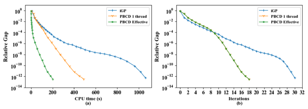 4. 交通网络均衡问题算法 设计高效并行算法,求解超大规模城市路网中的交通分配问题。以Chicago Regional网络为例,存在230万个OD对,4万条路段。研究成果可应用于城市交通基础设施的中长期战略规划。算法的收敛速度相比目前最高水准的iGP算法得到进一步提升。成果发表在交通运输领域知名期刊Transportation Research Part C: Emerging Technologies。