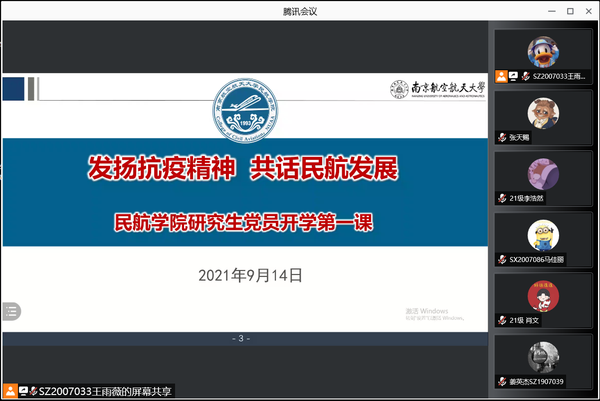 为传达学校疫情防控工作及相关要求,加强新老生的交流互动,同时帮助21级研究生新生形成对学院的认同感、归属感,尽快找准目标定位,走好“研途”,9月14日,成人抖音 党委书记刘建成为研究生党员作了题为《发扬抗疫精神 共话民航发展》的党课暨“开学第一课”。会议以线上形式召开,组织员侯美丽、组宣干事童肖、研究生辅导员及全体研究生党员和入党积极分子共200余人参加了会议。会议由学院20级研究生党支部书记王雨薇主持。