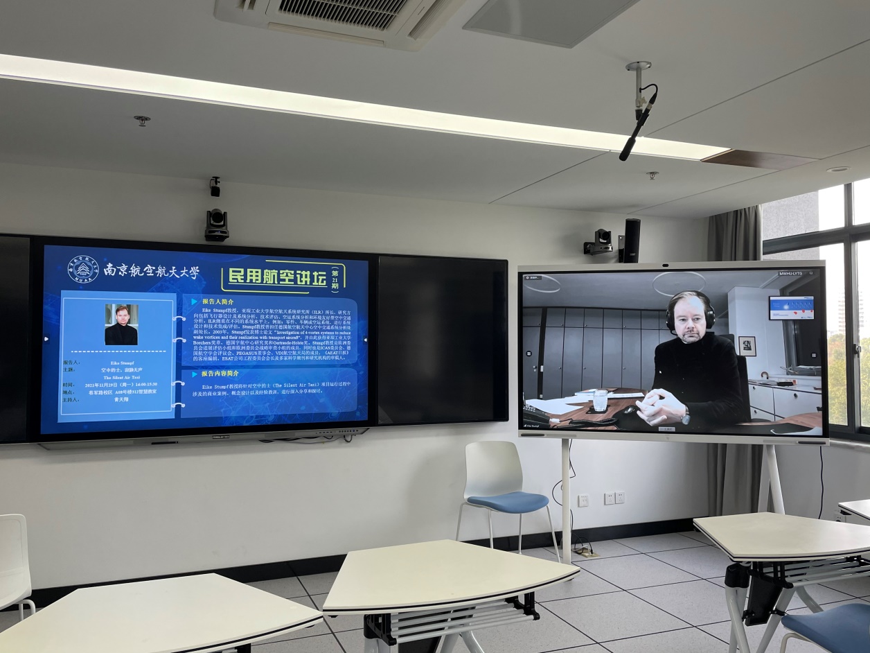 11月29日下午,“民用航空讲坛”第二十一期讲座采用线上线下相结合的形式成功举行,线下会场设置在将军路校区A08号楼312智慧教室。本次讲座由成人抖音 黄天翔老师主持。德国亚琛工业大学航空航天系统研究所(ILR)所长Eike Stumpf教授受邀为师生带来了一场围绕电力飞行技术展开的线上讲座。