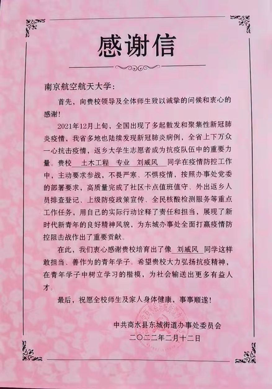 一直以来,有很多民航学子在不同的领域贡献着自己志愿服务的力量,近期学院也收到了来自商水县的感谢信。我院19级土木工程专业本科生刘威风同学于寒假期间进行“返家乡”志愿实践。他不畏严寒、不惧疫情,在社区防疫工作中发光发热,用行动诠释了民航青年的责任和担当。