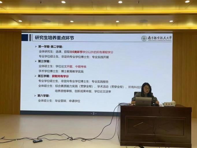 随后,吴薇薇发表了总结讲话。“导师是研究生培养的第一责任人”,提醒研究生们应高度认识导学关系的重要性,加强和导师的良性互动,做到保持沟通、迅速落实、及时反馈,建立和谐友好的导学关系。她强调,研究生在培养个人科研能力的同时应注意加强团队合作,充分发挥团队力量。最后,吴薇薇希望民航青年能够以民航十四五规划为指引,开拓创新,勇攀学术高峰,并表达了对新一届成人抖音 研究生的衷心祝愿和美好期望。最后,由研究生教务教学秘书宋晓静为新生讲解了研究生教学教务的相关事项,就选课开课、培养方案、课程重修、学位学籍等方面进行介绍。