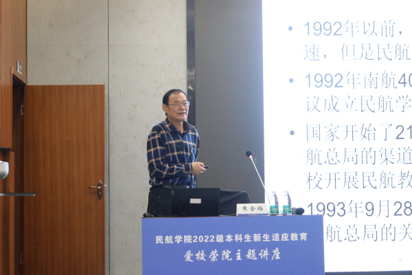 朱金福如数家珍讲述学院和民航业的发展史和大事件。改革开放以后民航业飞速发展,在国家部委、学校和校友们的鼎力支持下,成人抖音 于1993年正式成立并一步步发展壮大,离不开一代代民航人的不懈努力和接力奋斗。随后,朱金福从行业角度,用客观数据向同学们普及了民航及其发展前景,呼吁同学们开阔国际视野、树立创新意识、保持优秀品格、锻炼专业思维,为今后在民航发展前沿的奋斗路奠定基础,将实现民航强国理想成为矢志不渝的精神追求和终生事业。面对学习困难,他比喻道:“困难就像山,逃避积攒,山峰便会高耸入云;逐一击破,便会坦坦荡荡一马平川。”最后,朱金福向同学们提出殷切期盼,他希望同学们秉持“团结、俭朴、唯实、创新”的八字校风,让“爱校”成为大家的行动自觉、让“荣院”成为共同的使命担当,加倍努力、奋勇争先,相信自己、相信专业、相信学校,珍惜时间、把握当先、逐梦前行,以奋发向上的姿态和孜孜不倦的精神,成为更加优秀的民航人!