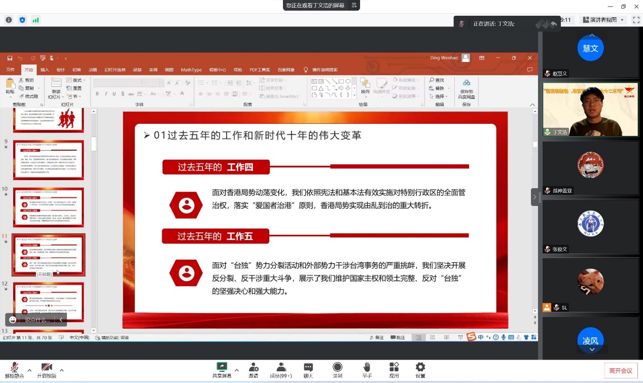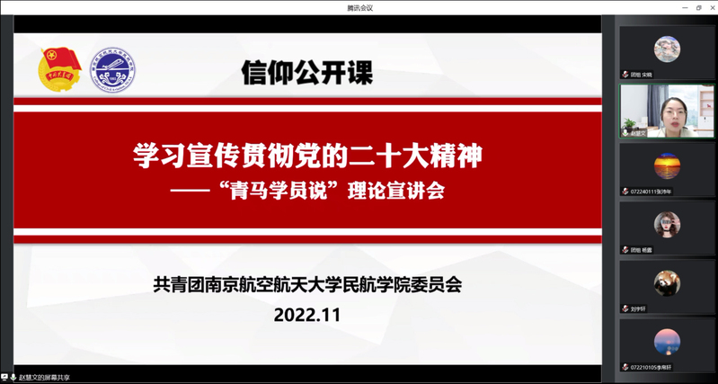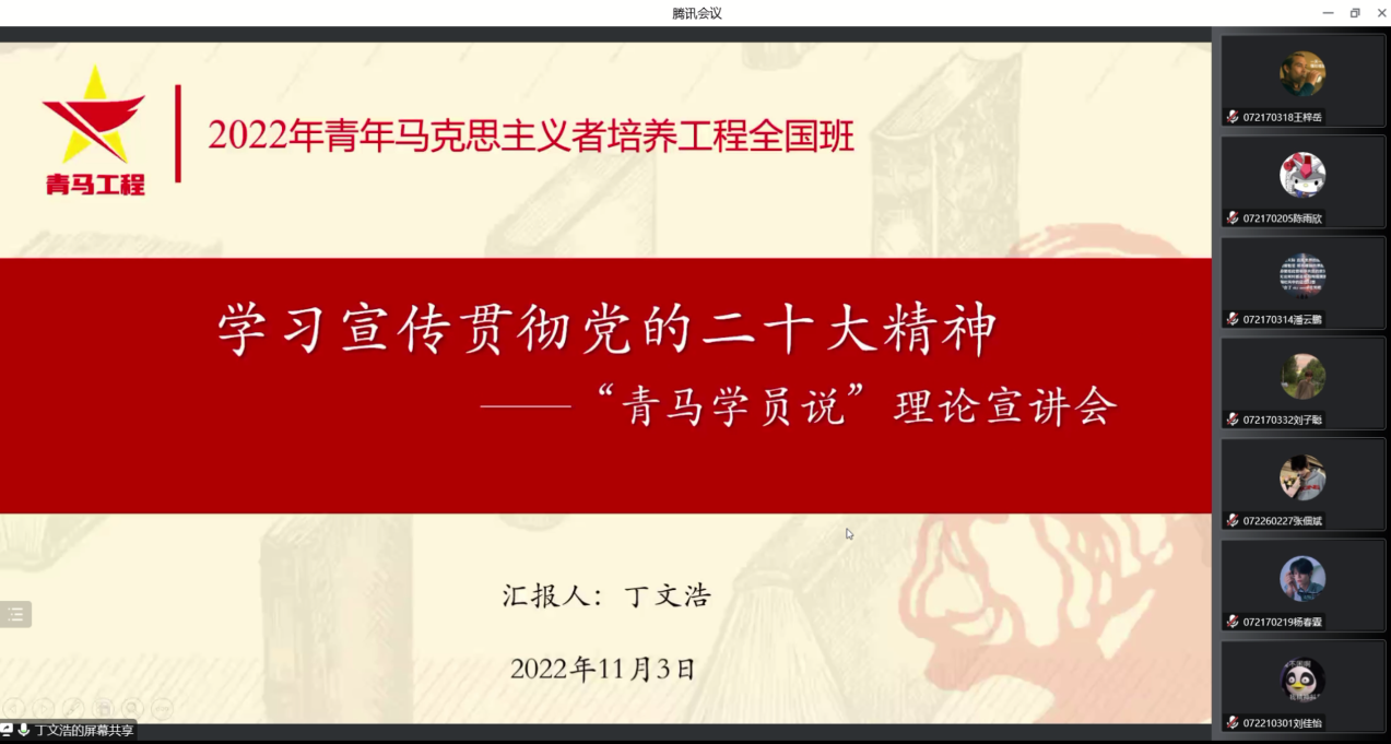 11月3日,成人抖音 举办青马公开课暨“青马学员说”理论宣讲会,专题学习党的二十大精神。全国青马工程高校班学员、成人抖音 硕士研究生丁文浩进行领学,成人抖音 天目湖校区全体团学骨干线上参与学习。本次活动由成人抖音 团委书记赵慧文主持。