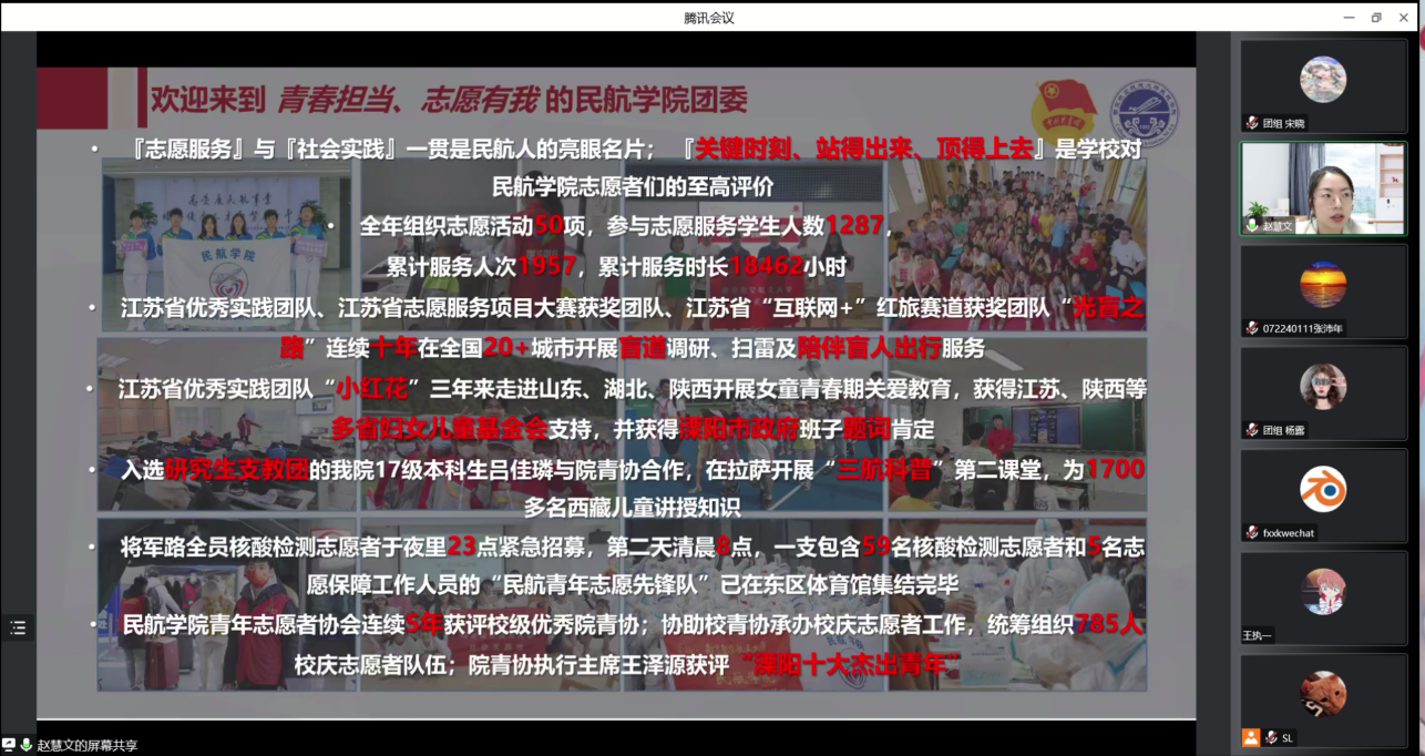 随后,赵慧文特别面向学院天目湖校区新生团干部介绍成人抖音 团委的工作特色与耀眼成绩。她以“敢想敢为、善作善成、有趣有识”高度概括民航团学工作,并以各项实际工作为例,展现了“薪火相传、荣耀接续”“文体强院、创意无限”“立足行业、民航强国”“青春担当、志愿有我”的团学组织形象,让团干们深入了解并思考学院团委工作。最后,赵慧文勉励广大团干部,要把思想和行动统一到党的二十大精神上来,怀抱梦想又脚踏实地,敢想敢为又善作善成,立志做有理想、敢担当、能吃苦、肯奋斗的新时代好青年。