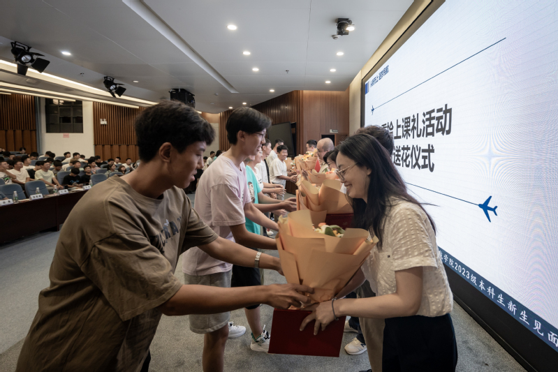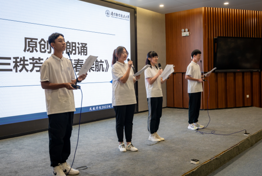 随后,新生代表为班主任们送上鲜花,同学们全体起立鞠躬,以齐声祝福的方式感谢师恩。2023级新生代表献上原创诗朗诵《三秩芳华,青春柒航》,同学们情绪饱满、声音洪亮,深情表达对民航事业的热爱和对学院建院三十周年的祝福。