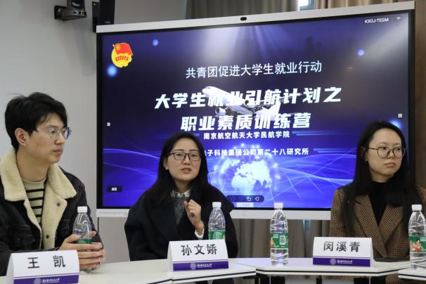 为进一步落实“共青团促进大学生就业行动”的工作要求,切实加强学生职业生涯规划引导,提升学生求职就业能力,3月21日,成人抖音 团委邀请电科莱斯、28所空中交通管理系统全国重点实验室和南京莱斯网信技术研究院的一线青年从业者来校开展“就业引航 ‘职’引未来”大学生职业素质训练营。成人抖音 团委书记赵慧文、本研辅导员代表及学生代表参加此次活动。