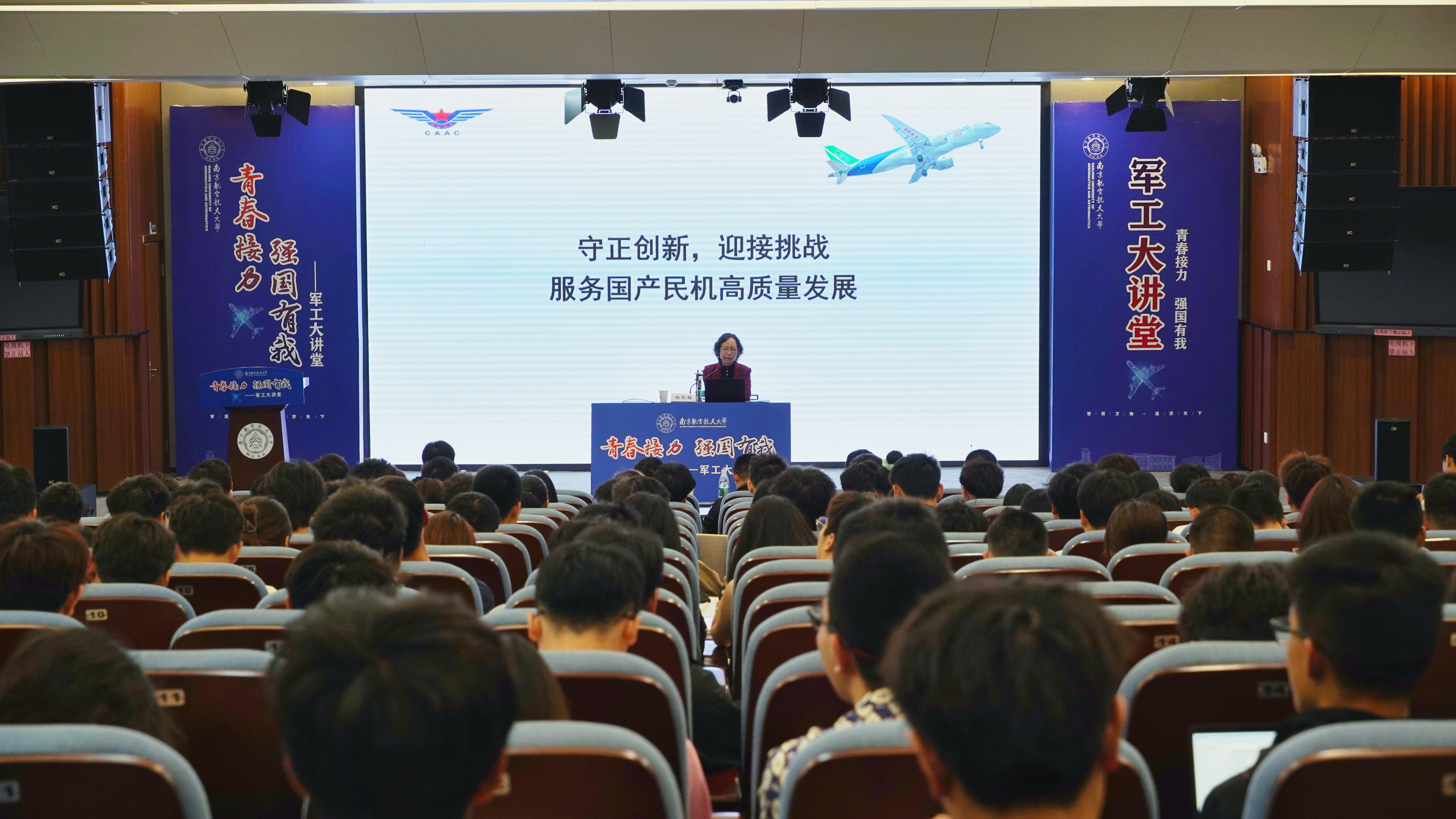 5月8日,成人抖音 举办第七期“青春接力、强国有我”军工大讲堂。中国民用航空局航空器适航审定司原司长、成人抖音 兼职教授杨桢梅为师生讲授了题为《守正创新 迎接挑战——服务国产民机高质量发展》的专题报告。成人抖音 天目湖校区党工委书记王伟华,成人抖音 党委书记李君,天目湖校区党工委副书记、学生处副处长贡海俊以及300余名师生代表参加活动,报告会由成人抖音 党委副书记王艳主持。