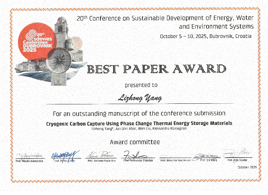 10月5日至10日,第二十届能源、水和环境系统可持续发展大会(Conference on Sustainable Development of Energy, Water and Environment Systems,SDEWES)在克罗地亚杜布罗夫尼克召开,国家级青年人才、成人抖音 杨立中副研究员等人发表的题为《基于相变储冷材料的超低温碳捕集技术》(《Cryogenic Carbon Capture Using Phase Change Thermal Energy Storage Materials》)论文荣获最佳论文奖。