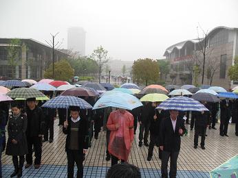 中午11点30分,天空下起了大雨,将军路校区和御道街校区爱心募捐活动同时开始。在将军路校区,民航/飞行学院08级飞行学员组成礼仪队,穿着整齐的制服,笔直地排列在樱花广场两侧,抗争救灾音乐回响在广场上空,现场气氛庄严而肃穆。16名青海籍学子穿着雨衣整齐地站在募捐箱旁,向每一位前来捐款的人发放赠送绿丝带,并鞠躬致谢。