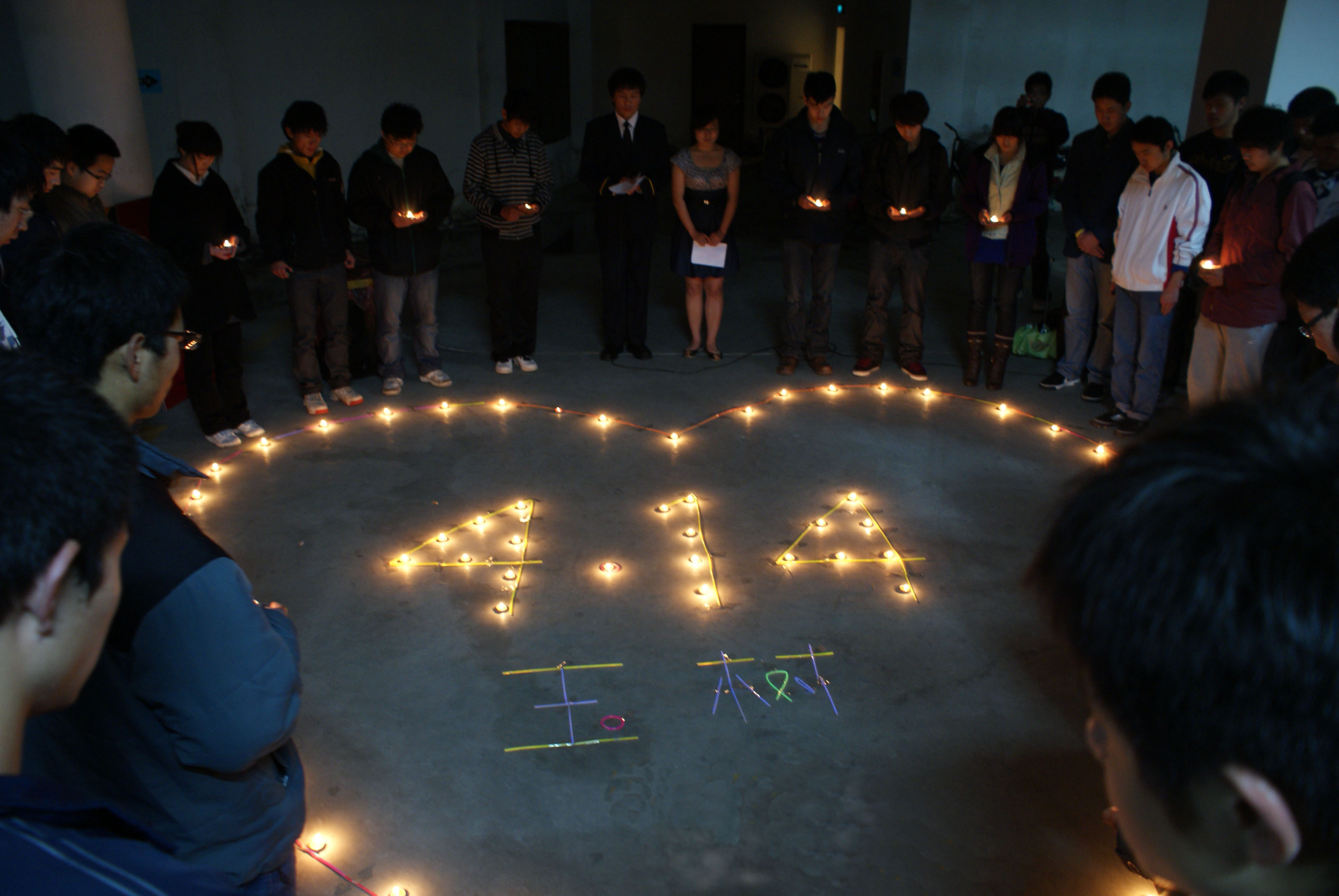 音乐声起,随着一个青海籍的男生点亮了第一支蜡烛,烛光在全场亮起,爱心也在南航学子们的心中传递。跳跃的火苗拼凑成心的形状,包围着数字状的四月十四,这是玉树地震的日子,是举国同悲的日子,是我们纪念的日子。火光照在每个人的脸庞上,映出一颗颗赤诚之心最深处的哀悼。感觉一夕之间,见证了灾难的每个人都长大了些许,有了对于生命,对于生活的全新认识。