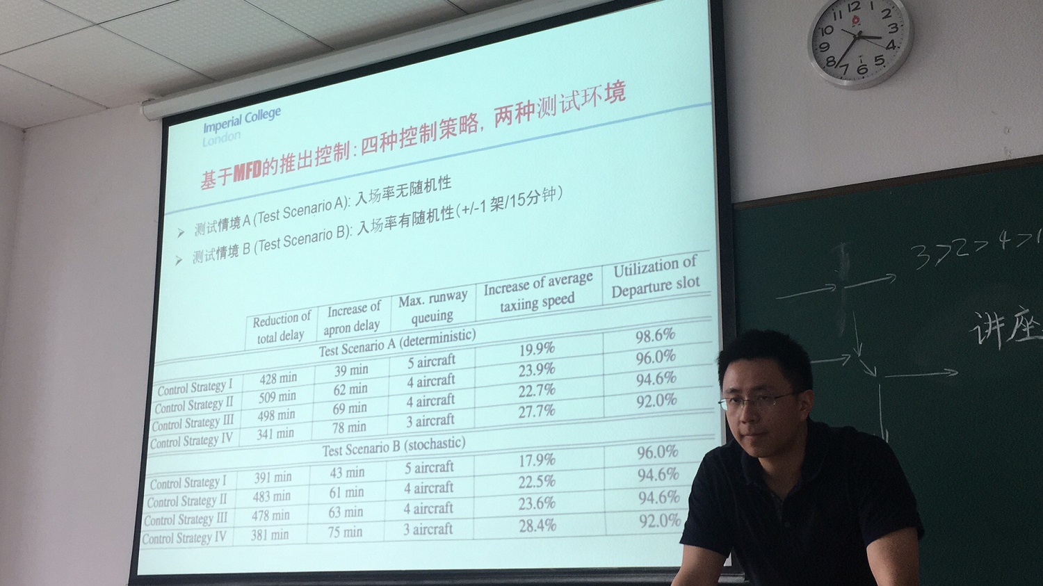 讲座中,韩科博士介绍了如何将元胞传输网络模型应用并拓展到机场场面网络中,同时通过实测数据验证了元胞传输模型的可行性和准确性,揭示了场面网络宏观基本图的存在性。然后基于鲁棒控制理论提出多种推出控制的策略,验证了策略在减少滑行道延误方面的有效性。最后韩科博士与在场师生就元胞传输模型等方面的问题进行了互动交流。