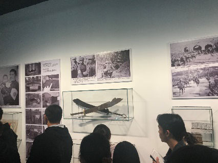 接着,我们来到了左侧展厅,左侧展厅陈列的是有关于南京大屠杀的藏品。率先进入我们眼帘的是两把交叉的日本武士刀,陈刚讲解员告诉我们,曾经有一个三年级的孩子在看到这件藏品时对他说:这是一把沾满了鲜血的刀。是啊,日本对中国进行惨无人道的大屠杀行为,是每个中国人都不应该忘记的历史,而日本政府对历史的歪曲否认中国更是不能接受。随后,陈刚老师向我们展示了著名的替父谢罪信以及当时人民日报的头条报道,日本友人西山诚一在2015年12月14日参观完南京民间抗日战争博物馆之后,交给了吴先斌馆长一封“道歉信”,替参加侵华战争的父亲向南京人民、向中国人民道歉。这一封道歉信具有重要的历史意义,它证明了南京大屠杀的真实性,也证明了有关南京大屠杀的怀疑是没有根据的。