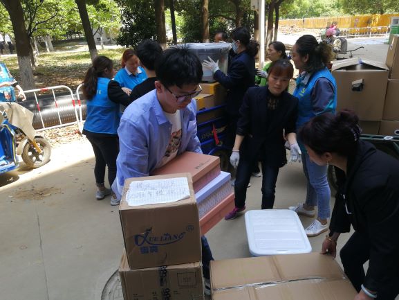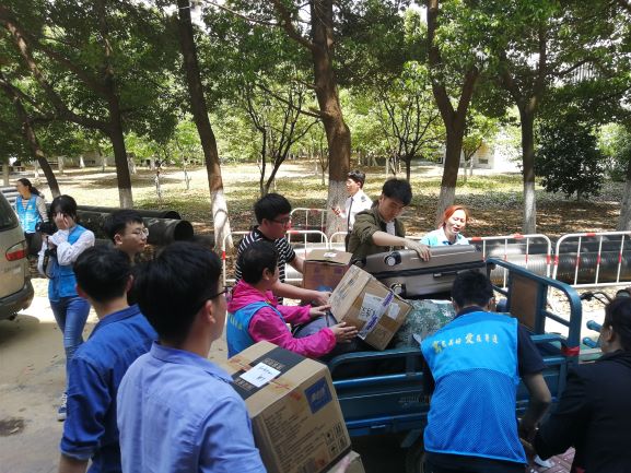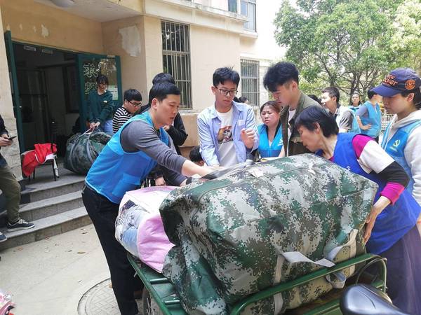 图四为党支部老师和同学协助阿姨装运行李