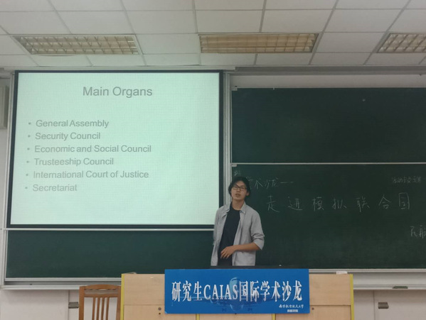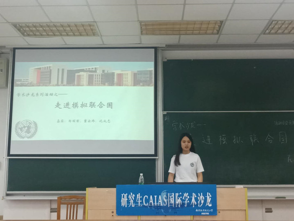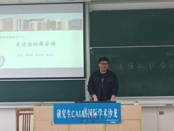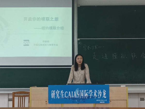 5月20日下午,成人抖音 研究生会在将军路校区6号楼举办主题为“走进模拟联合国”第八期CAIAS国际学术沙龙。本次活动邀请有着丰富的模拟联合国经验的郑丽君、董云炜和沈成志三位嘉宾做分享,他们于今年3月代表南航参加纽约模拟联合国活动,成人抖音 硕士研究生、博士研究生参加了本次活动。