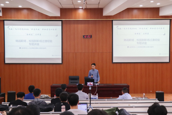 2019年5月23日下午,成人抖音 2016级开展了“职通民航”职业素质培训营中“企明星”大讲堂系列活动。本次活动邀请了吉祥航空人力资源部招聘组经理田崇伟先生,与成人抖音 校友吉祥航空运力网络部的孔彪先生,为同学们开展主题为“转战职场,校园到职场过渡经验”的专题讲座,从如何做好职业规划、面试技巧与时间管理三个方面详细阐述。