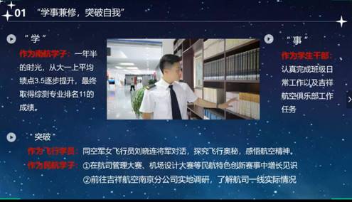 飞行2019级张博昱同学分享了天目湖开拓者的故事,作为天目湖校区最早的一批学生,他不仅适应了飞行学员准军事化管理,极度自律,达到了考核标准零扣分,还勇于承担班委责任,树立班干部带头作用,绩点排名飞行技术专业的前1%,带领班级体共同进步。