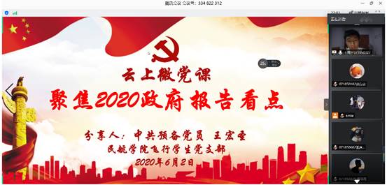 最后飞行学生党支部书记吴泊鋆老师做了点评,吴老师首先对四位同学带来的微党课表示肯定,其次也对两会内容进行了更深刻的讲解,从新时代的三大战役:疫情防控战、脱贫攻坚战、经济保卫战谈到到与我们近在咫尺的高校扩招政策。他说道,此次两会意义非凡,可以用“精彩”、“经典”、“惊艳”来形容。讲话的最后他将一句“让担当者担当,让履职者尽责。”送给大家勉励大家不断进步,展现自己的担当。