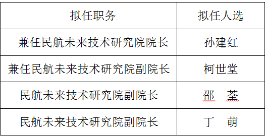 经学院党政联席会讨论、党委会研究决定,拟任用以下同志为民航未来技术研究院担任相应干部职务。根据任前公示有关文件规定,现予以公示。