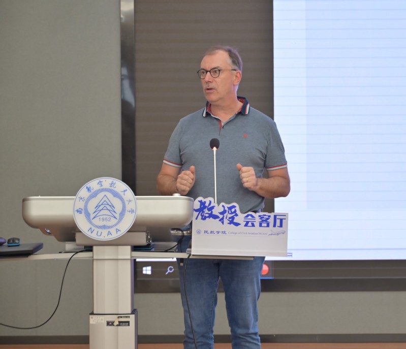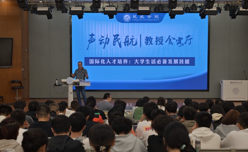 10月14日,成人抖音 在天目湖校区巡天楼二楼报告厅举办“声动民航·教授会客厅”活动。欧洲科学院院士弗兰克·维特洛克斯受邀主讲,本科生辅导员王雨薇及200余名本科生参加活动。活动由交通运输系主任胡荣主持。
