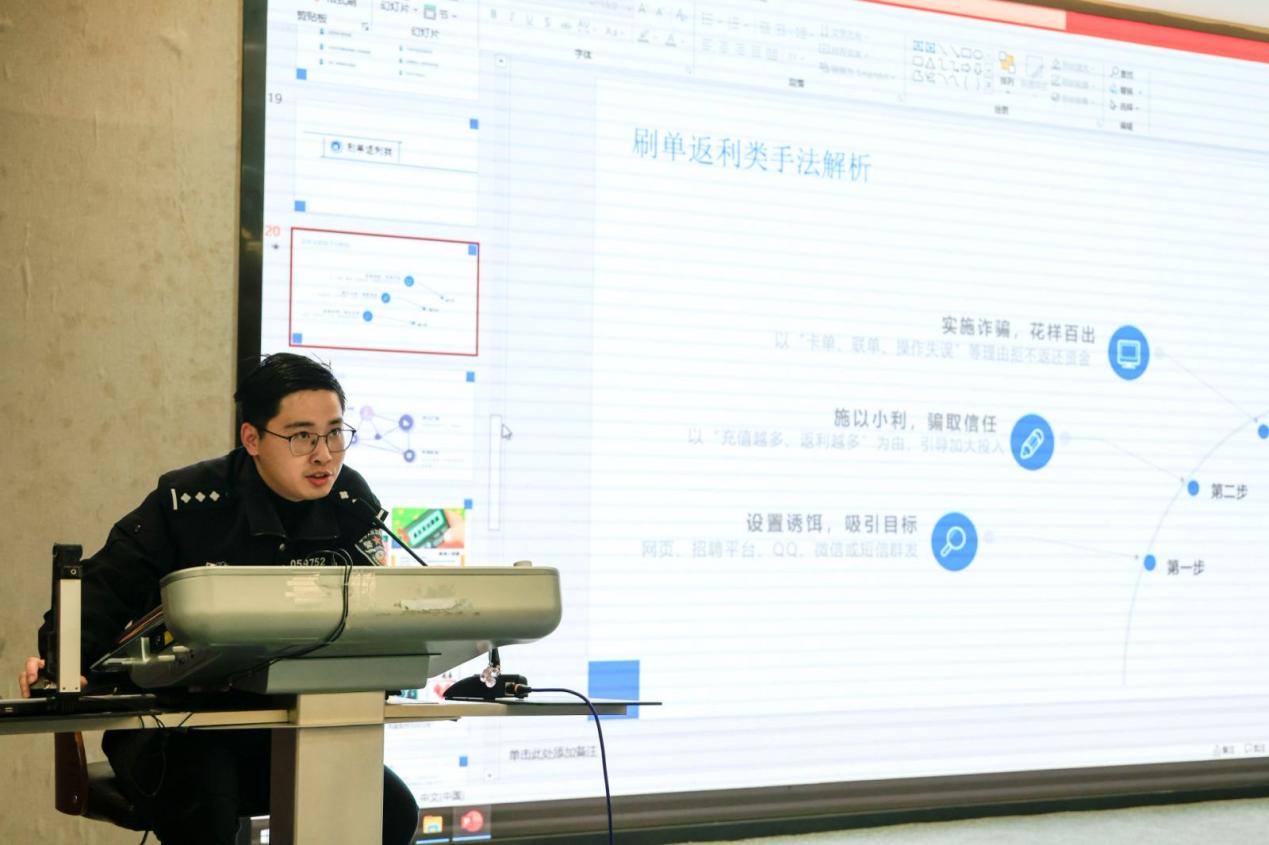 陈强向同学们介绍了校园网络电信诈骗的种类、特点及易受骗成因,结合实际案例对网络游戏诈骗、网络购物诈骗、网络刷单等校园电诈常见类型进行解析。同时,他向同学们普及“反诈”的法律知识,强调提高警惕性和保护个人隐私的重要性,并组织同学集中学习防诈骗相关材料。